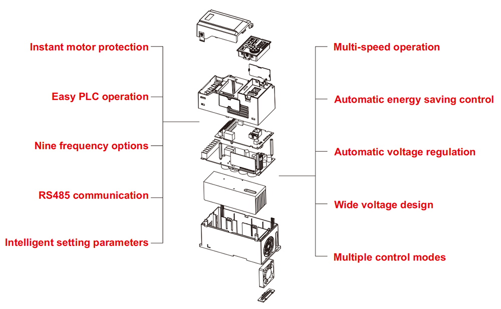 | Ochrona falownika | Ochrona przed utratą fazy wejścia/wyjścia, wykrywanie niedociążenia, ochrona przed nadmiernym momentem obrotowym, ochrona podnapięciowa, ochrona nadnapięciowa, ochrona nadprądowa, ochrona przed przegrzaniem, ochrona przed zwarciem międzyfazowym |