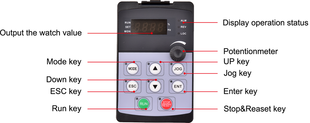 | Sygnał ustawienia częstotliwości | Zintegrowany panel operacyjny | Przełącznik membranowy (przycisk), pokrętło prędkości (potencjometr) |