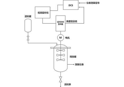 | 04 Wprowadzenie do systemu: W tym systemie falownik RVE32 o mocy 7,5 kW napędza silnik miksera o mocy 7,5 kW, napędza łopatki wentylatora mieszającego w celu mieszania, a następnie równomiernie miesza przez zawór próżniowy, a następnie przesyła mieszaninę do pompy zasilającej, aby po spełnieniu wymagań wzięła udział w kolejnej reakcji chemicznej. Uruchomienie/zatrzymanie przetwornicy częstotliwości odbywa się poprzez kolumnę pracy w terenie, a przetwornica częstotliwości przekazuje rzeczywistą wartość prędkości silnika do DCS, a operator mierzy sygnał i rzeczywistą wartość prędkości zgodnie z przyrządem zbiornika mieszającego. Wydaj polecenie do przetwornicy częstotliwości, aby zwiększyć lub zmniejszyć prędkość odniesienia silnika. | | ||||||||||||||||||